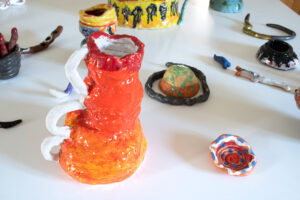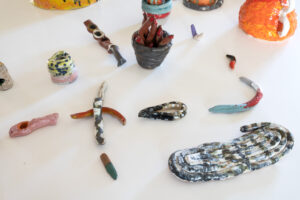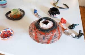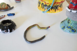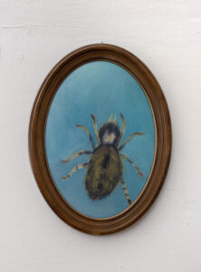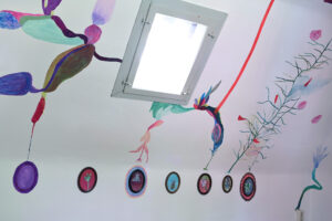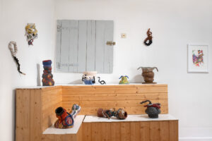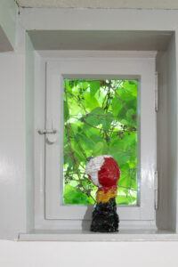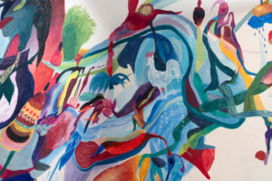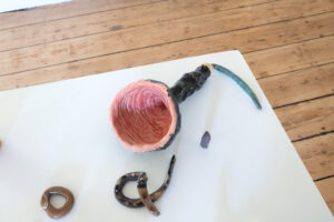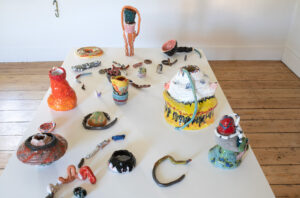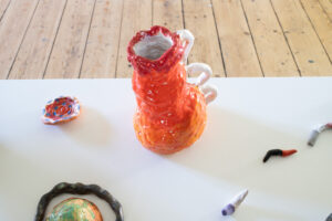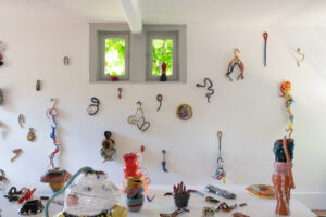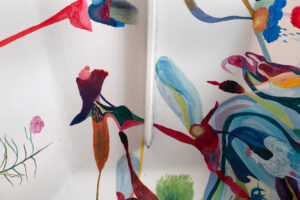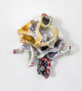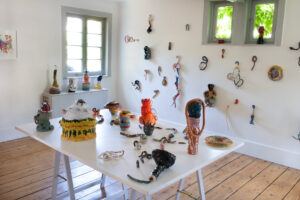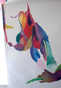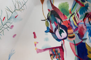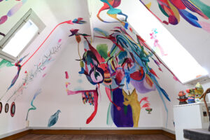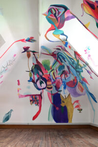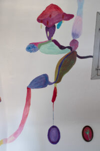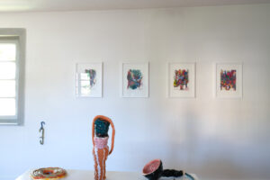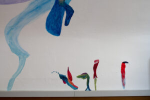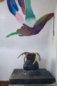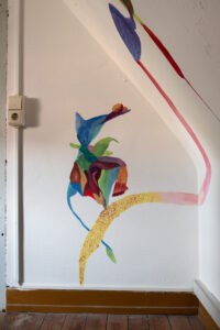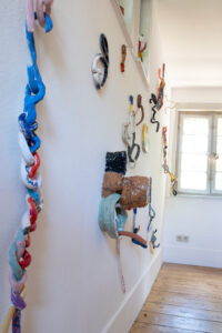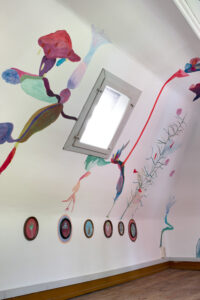 Für FIRST habe ich eine Installation über zwei Stockwerke in der Spinnerei Esslingen entwickelt, in welcher unterschiedliche Malerei-Akteure miteinander kommunizieren: erotisch glänzende Keramiken der Serie „Salon“ (2023-2025), die den gesamten Raum des 1. O.G. bevölkern, treffen auf intensive, matte Buntstiftzeichnungen der Serie „Worte aus der Umgebung“ (2022-2025); und dann wandern einige der Keramiken ein Stockwerk höher, unter den Dach-First, dessen kleinen Raum eine ausgreifende Wandmalerei („First“, 2025) eingenommen hat. Inmitten derselben sind kleine, fein ausgearbeitet Aquarelle der Serie „Kreuchen und Fleuchen“ (2025) zu entdecken, Porträts von Pflanzen und Tieren zeigend, die auf dem First oder nahe des Firsts leben.